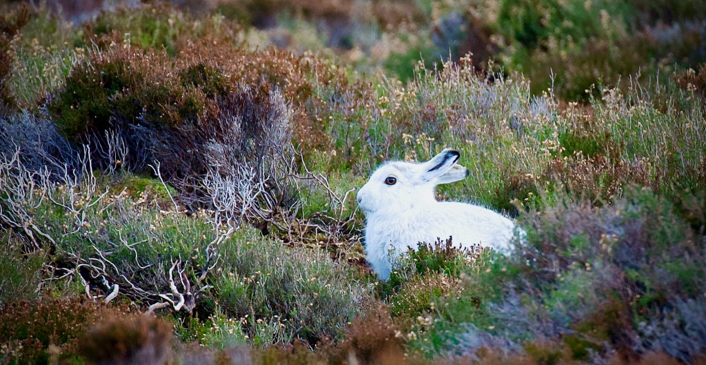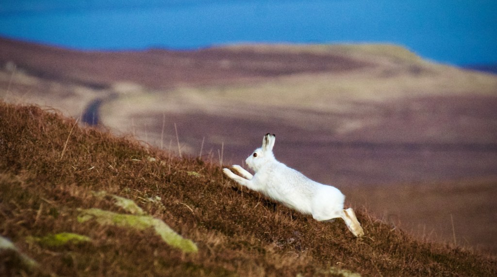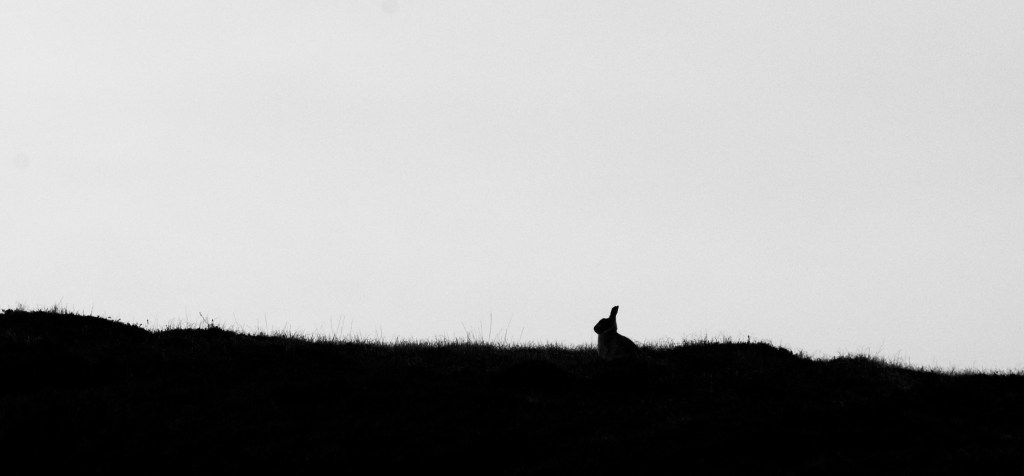 In Orkney, Mountain, or Blue, hares, are found only on Hoy. Although native to the uk they aren’t native to Orkney. It’s generally believed that they were introduced to Hoy and a few other islands, probably for sport, in the late nineteenth century. Although, just to muddy the waters, there’s a record from 1529 that tells of white hares being caught by dogs. However they arrived they have over time become absent from other islands in Orkney. The Brown hare, introduced to the UK by the Romans, is also found in Orkney but is absent from Hoy. The hares turn white in winter, clean as snow beneath and blue-grey on top, the colour of gun smoke.