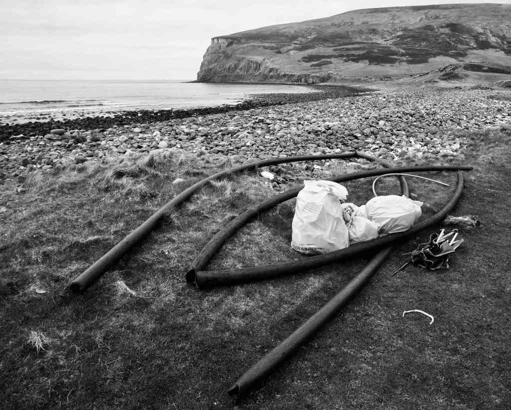 Rackwick comes from the Old Norse, rack is wreck or wreckage, wick an open bay. A remote and beautiful spot. The shore is ever changing, shaped by the moods of the tide. Stone dominates, a mix of car sized boulders through to fist sized cobbles, but to the south, at low tide, there’s also beach of smooth golden sand. It was once a thriving crofting community, with a population in 1851 of 101, now the permanent residents can be counted on the fingers of one hand. The volunteers split into small groups, we head to the north end of the bay, a beach of tumbled stone, and start to fill our bags. A bright orange glove, a yellow welly, rope and torn net. Long lengths of black aquaculture pipe, bent by the sea, have the look of a pair of giant fire blackened ribs. A dinghy, torn beyond repair, is hauled from the shore and stashed in a roofless byre. Plastic bottles are picked up by the dozen.