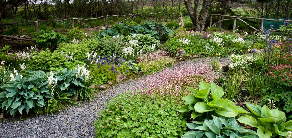 A shady border, Hostas and a white form of Spanish Bluebell.