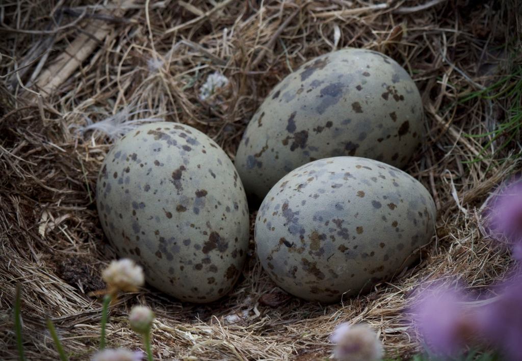 On the same walk, a few yards from the narrow footpath, tucked amongst a patch of bright pink sea thrift, there’s the nest of a Lesser black-backed gull. A simple scrape in the earth lined with a few wisps of grass that holds a clutch of three olive green eggs, each egg dotted with browns and soft blue-greys, as if randomly dabbed with a brush. As you approach, the bird slips quietly from the nest, watching you from atop a nearby lichen silvered rock, returning to the nest just as quietly as you walk on into the distance.