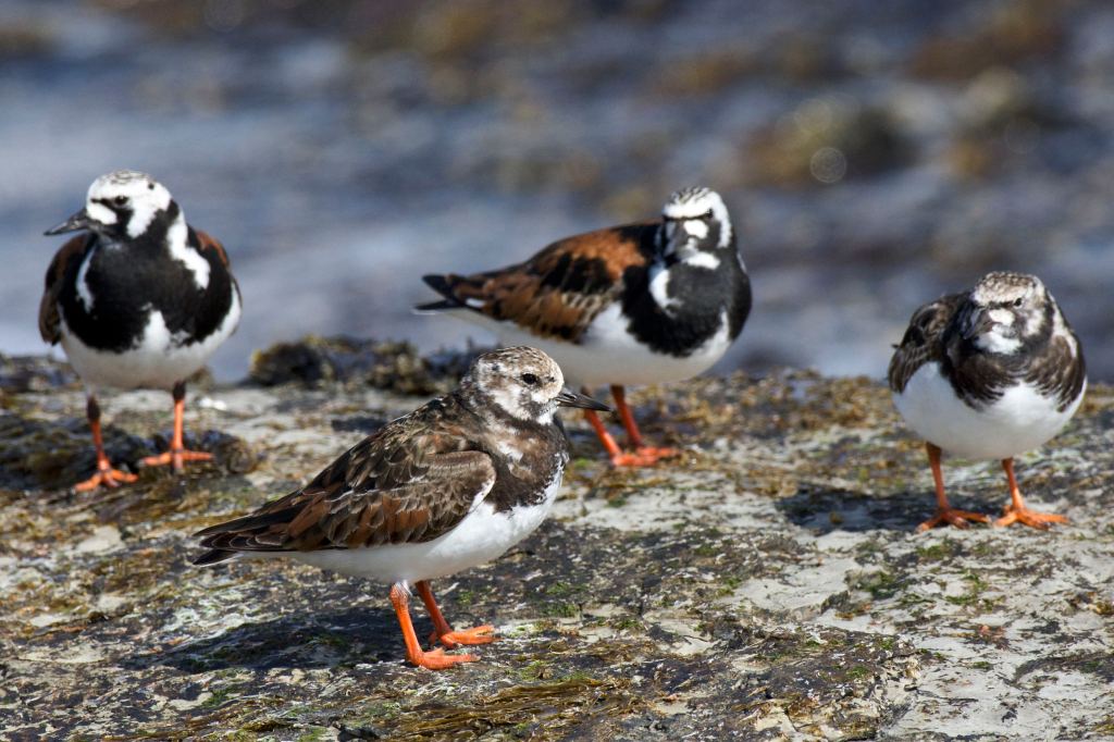 Turnstones were busy exploring the shore. On shingle beaches they live up to their name, on an area of sea smoothed rock, with no stones to flip, they were searching for goodies amongst seaweed left exposed by a retreating tide. Almost missed were two Dunlins, small starling sized birds that belong to the stint family, their name comes from the colour of their backs, dun – dull brown.