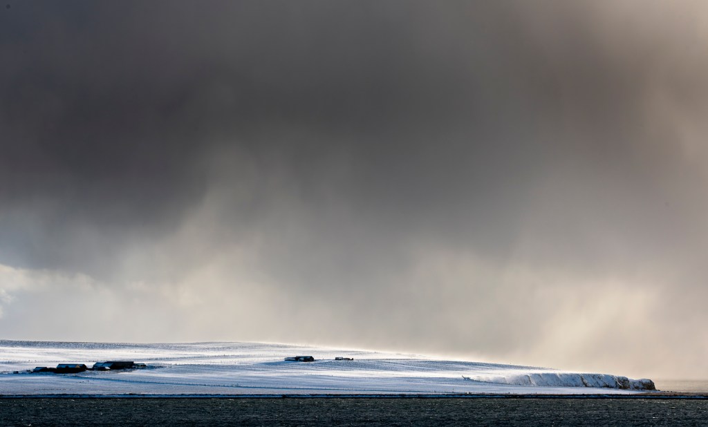 Elsewhere, in less sheltered spots, the drifts were stone-dyke high. Impossible to tell where fields ended and roads began. From where I’m sitting I can see, a mile or so across the bay, a farmer laboriously clearing snow from a single track road on the linked island of South Walls. He’s been at it since dawn and will continue all day, forward a few feet, tip the loader bucket, forward a few more feet, rinse and repeat. The roads are being cleared so that the islands doctor and nurse can make home visits, the very sensible advice to everyone else is to stay put.