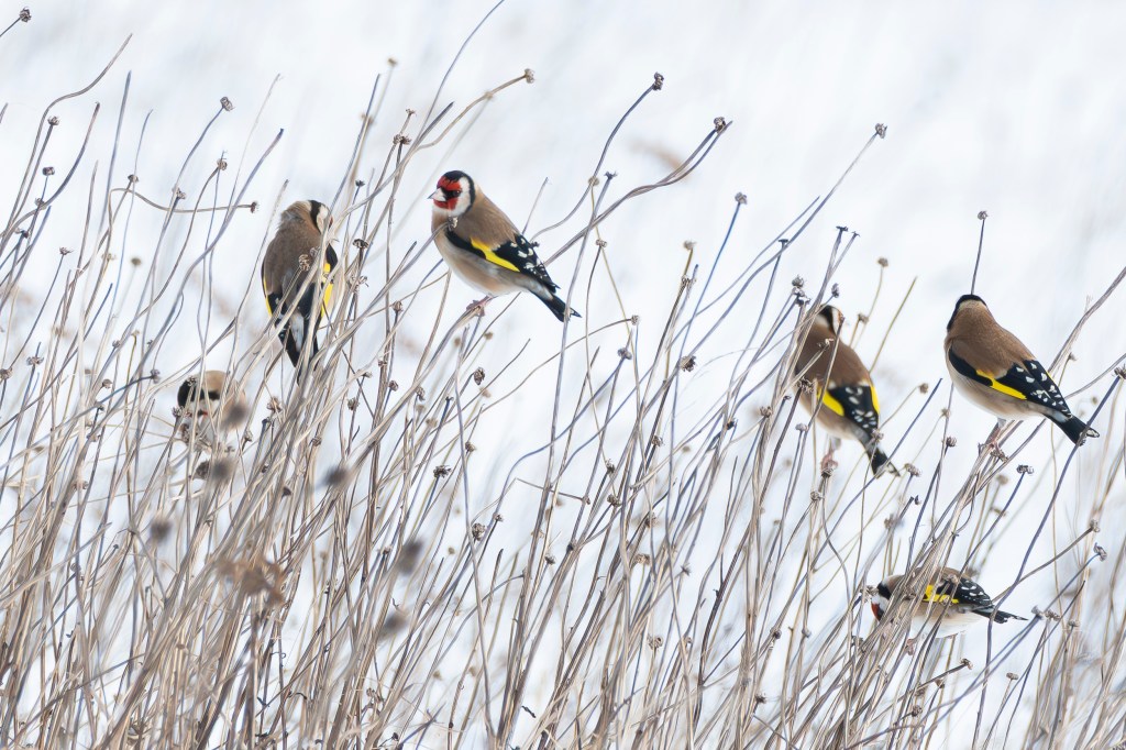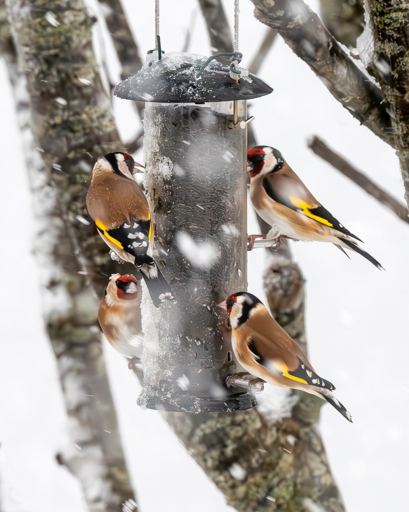 I don’t know the collective name for a group of goldfinches, but judging by your picture it should be a ‘glory’. What a sight to see against the snowy backdrop.
