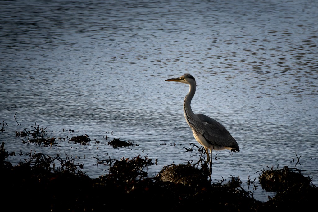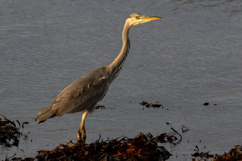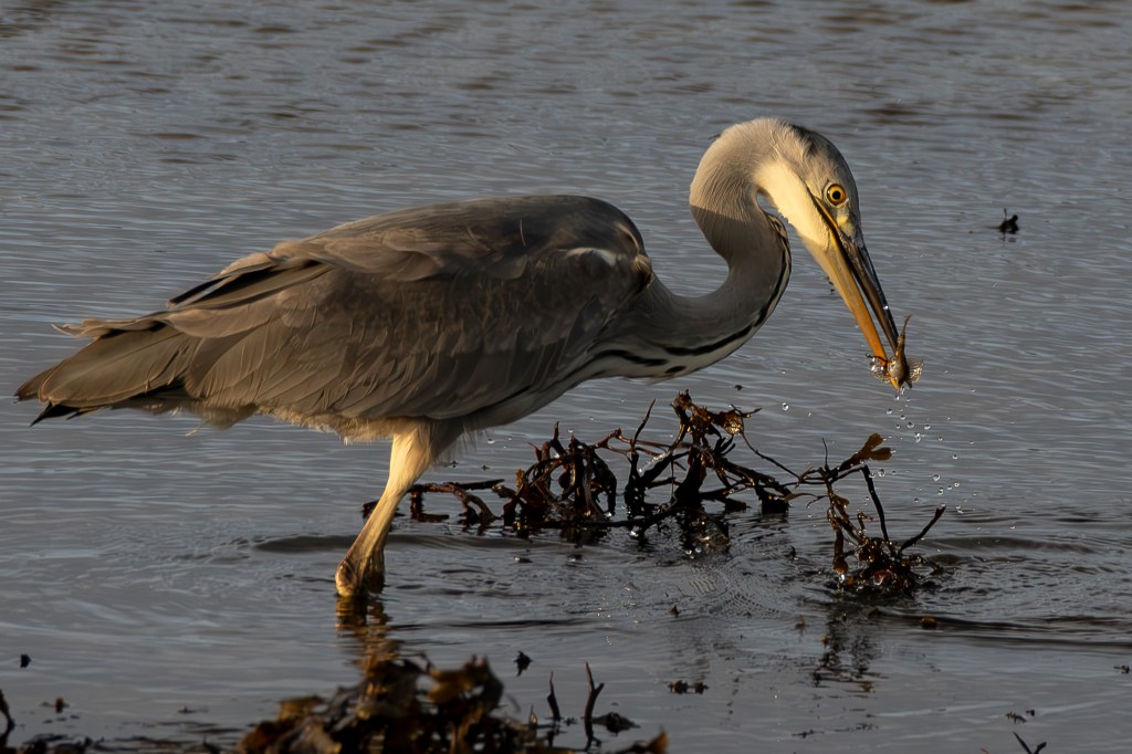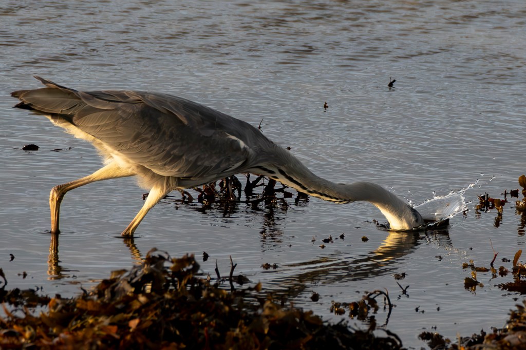 I expected him or her to lift off, accompanied by a vocal and complaining craak, heading for pastures new. The bird though stayed put, knee deep in the shallows, amongst drifting floats of air-filled bladderwrack. I sat down, the bird stood motionless, eyes off me and back in the zone, looking forward and down, studying the water with a hunters intent.  Eventually patience, for both bird and photographer, paid off, the heron struck, a fluid snake-like strike with a dagger of a bill. Barely registering a splash on the surface of the bay.