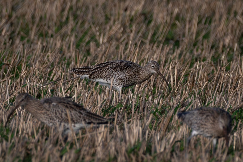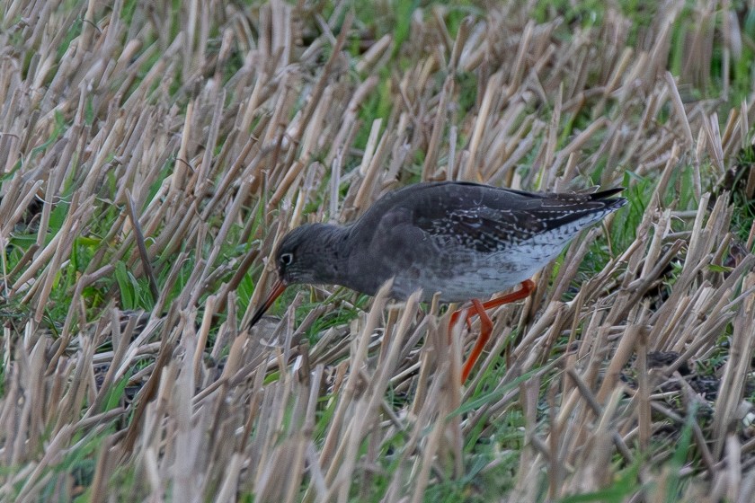 Not far from the neeps and sheep, there’s a field of oat stubble, with the islands wet ground it will stay unploughed until late spring, indeed stubble here sometimes doesn’t get ploughed at all, cereals are often under-sown with grass and simply green to a ley the following year. The field is a magnet for many species of bird, from finches through to greylags. It’s a favourite spot for long-beaked waders, Curlews and Oystercatchers and diminutive Redshanks, whose bright legs that give them their name, are barely long enough to raise them above the stubble.