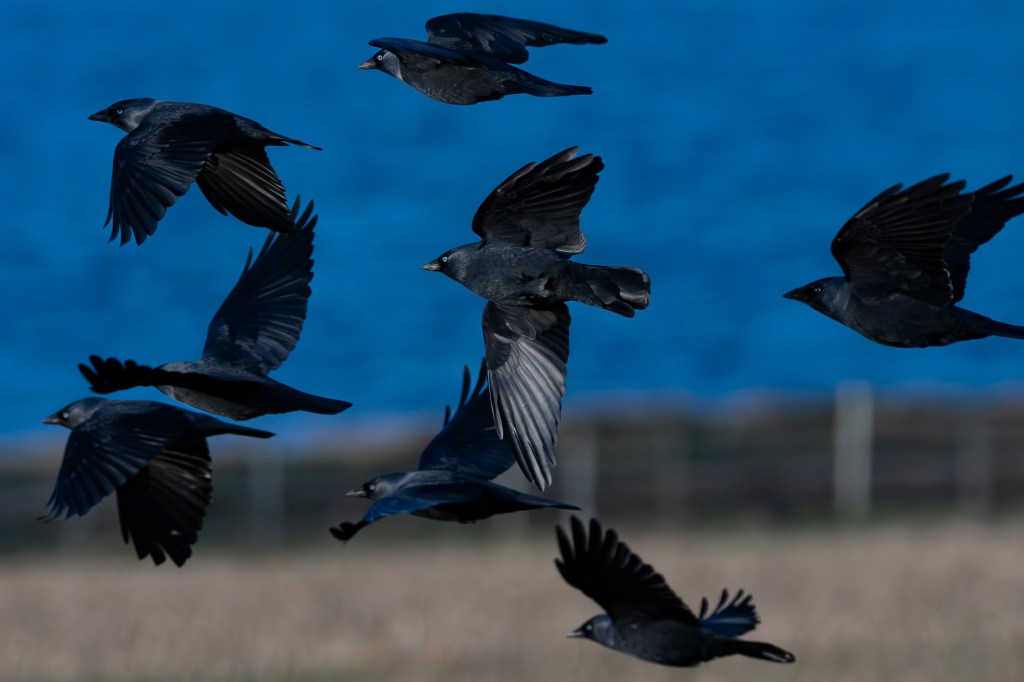 A flock, or clattering, of Jackdaws are there most days, feeding amongst hollow stems scissored off by the harvester. Heads down with beaks in the soil the birds form a carpet, a loose and slow moving drift of feathery grey-black, seeking seeds and unlucky invertebrates. They say if you watch nature you’ll learn something new everyday, that days lesson, when I watched them lift off, was just how bright and jade green their eyes are.