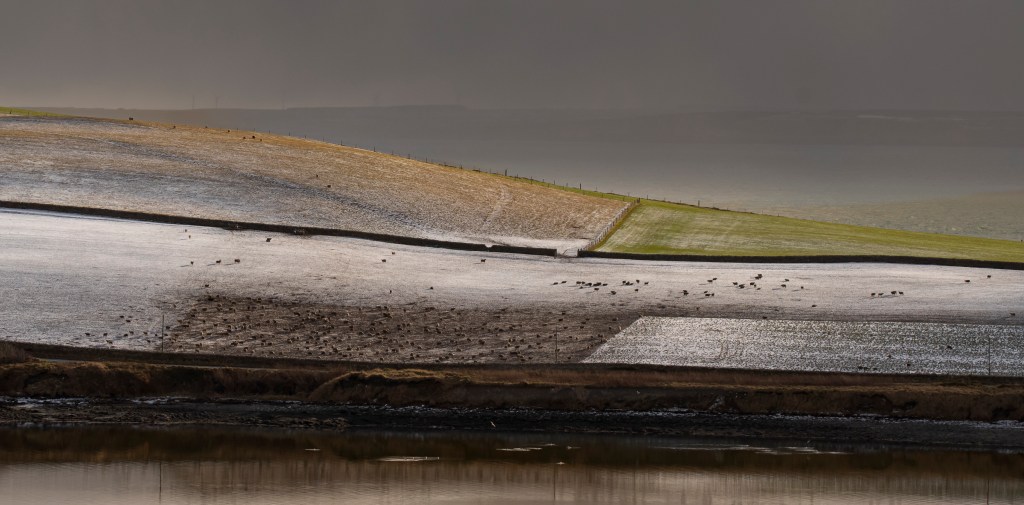 On the the way down from the moor I photographed a distant South Walls landscape, a patchwork of stone dykes and small fields, lit by a burst of late afternoon sun. Sheep were being folded on neeps, sown in late Spring for the purpose of bringing ewes through a long and cold winter. The ewes are moved every few days onto a piece of new ground, the precious muck that they leave behind enriches and fertilises the soil. Next year, as part of a traditional rotation, the field will be barley, or pasture.