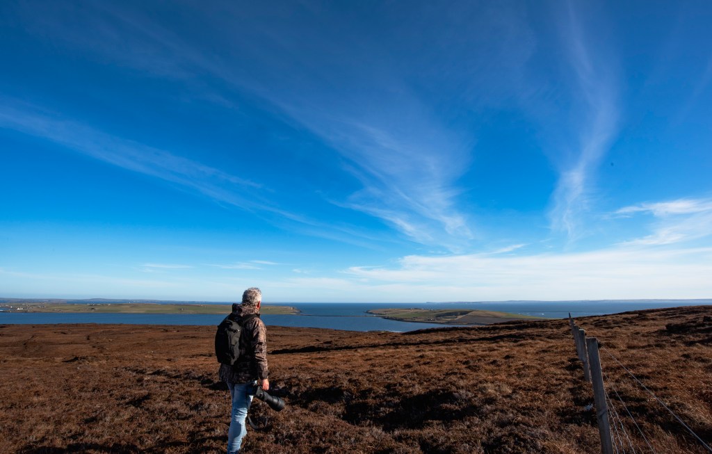 As you climb higher the view opens up. A fence post becomes a handy tripod, with camera balanced and fingers crossed that it wouldn’t fall off, I tripped the self timer and walked into the frame. To my right there’s Hoys southerly tip, the headland of Brims, with the open scar of its now disused quarry. The source of the stone that built the ex croft house that we live in, ditto many of the other homes that dot this landscape. Above Brims, beyond the dark blue waters of the Pentland Firth, there’s a faint grey smudge, the coast of Scotland, the county of Caithness. To my left lies the island of South Walls and centre frame there’s the thin black line of the Ayre, the narrow causeway that ties each island to the other.