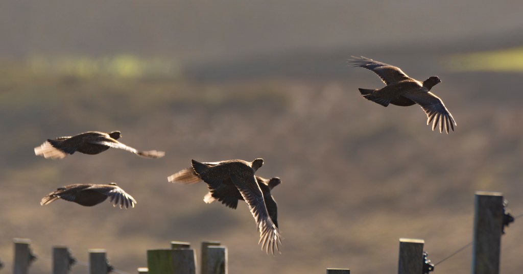 February rains have made the ground spongy and sodden, walking uphill from the garden is akin to walking on a trampoline that has been covered in treacle. As the ground levelled I followed the boundary fence, heading for a makeshift stile. A covey of nine birds bursts from the heather, a blur of wing and bodies. I swung through them as you would with a shotgun, catching five of the nine as they topped the fence.