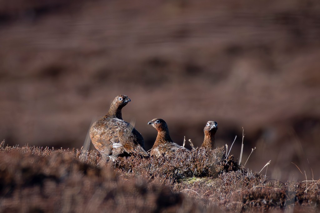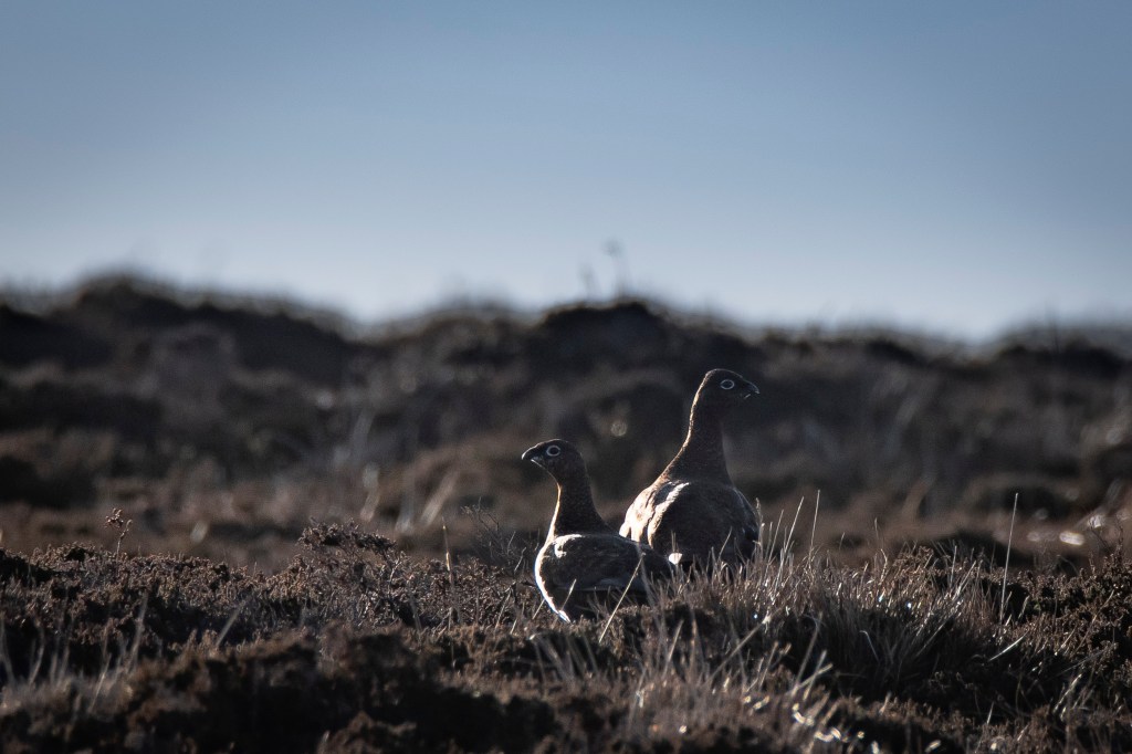Red grouse are unique to Britain and Ireland. Along with the Mountain Hare and Hen Harrier for me they’re an iconic species of open moorland. Their Latin name is Lagopus scotica, the first, lago-pus means hare-foot, a reference to feathered feet that give them traction when snow is on the ground, the latter means of Scotland, a bit of a misnomer as along with the Emerald Isle, they’re also seen from the moors of Cornwall through to the Northern counties of England. With dusk approaching I walked the same route home, the last frame of the day was taken back in the peat cuts. A pair of birds, probably yearlings, caught by the last light of the day.