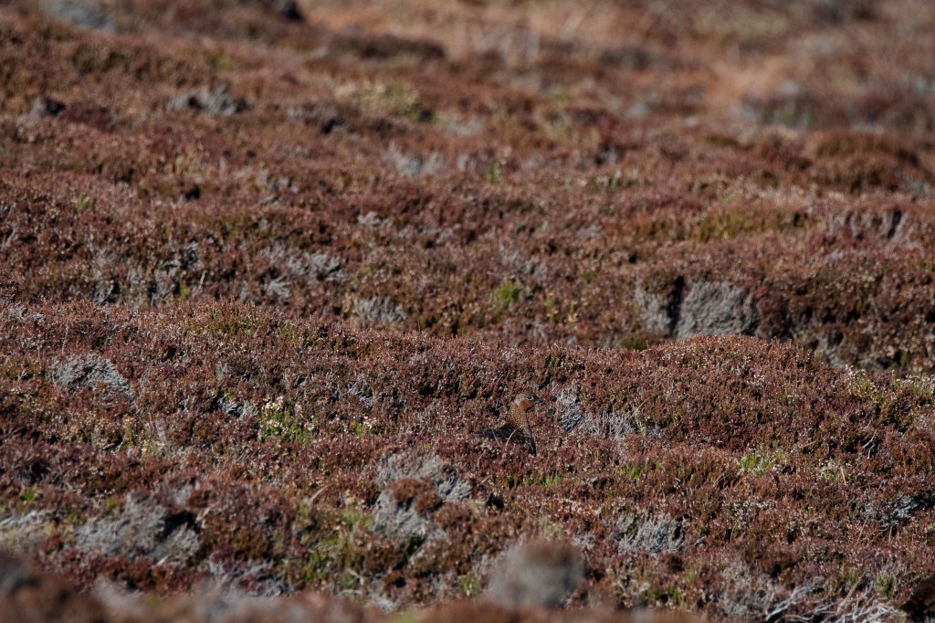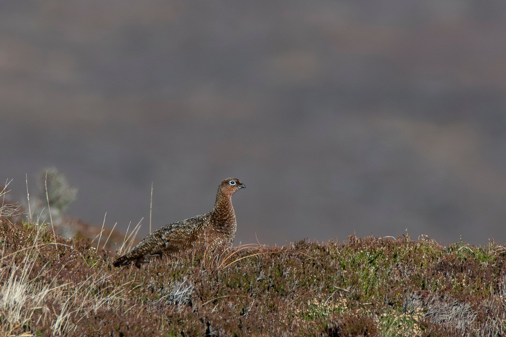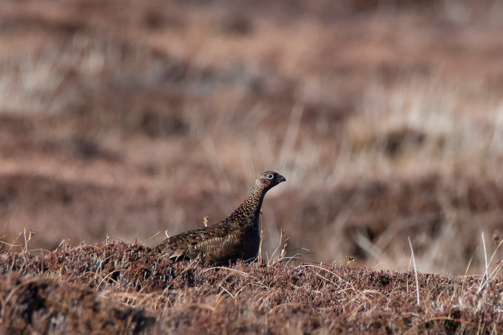 As the ground rises again more grouse are seen, a female appears, a moorfowl, she blends perfectly with the heathers and grasses. In April or early May, she’ll lay a single clutch of eggs in a nest so well hidden amongst the heathers, that only if you almost step on her, will she reveal its location. There’ll be perhaps 10 or more eggs, each speckled with blacks and red-browns, the colours of her plumage.