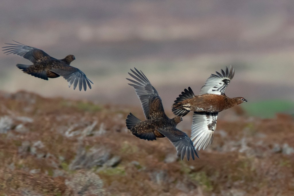 Her mate, the moorcock, appeared a few moments later, stocky and alert, darker in plumage with lipstick-red eyebrows. A bird whose image has adorned thousands of bottles of Scottish Whisky.