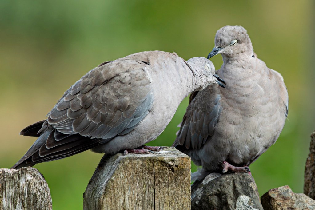 Two other closely related species that are here in numbers are Rock doves and Collared doves. The former are avian hoovers, arriving daily at dawn to clean up anything and everything. They remind me of Black Friday shoppers, all rush and sharp elbows. Once sated they lurk for a while along fences and dyke tops, just in case more food is put out.