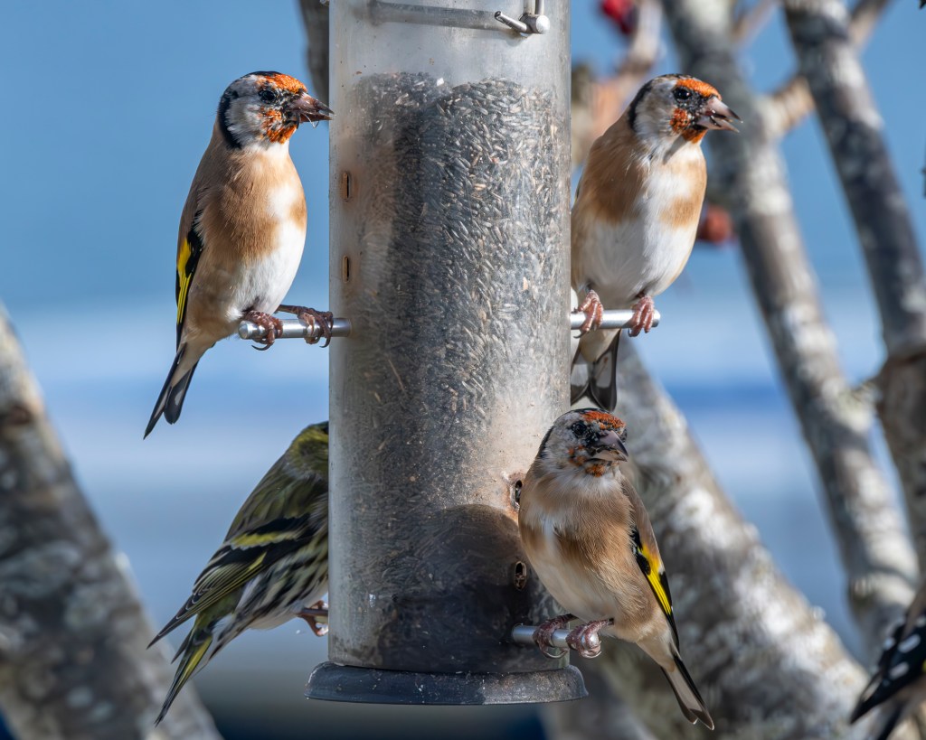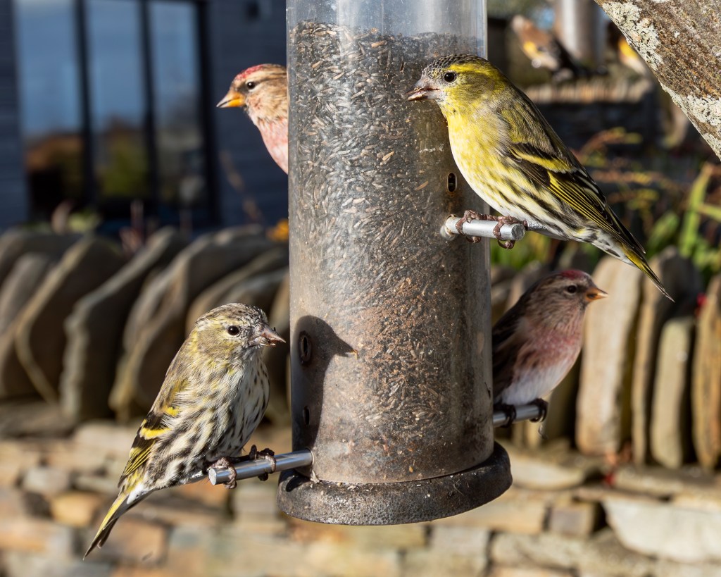 Garden birds are coming and going. We’ve seen an influx of Greenfinches this week, a flock of perhaps forty birds. They vie for feeder space with winter resident Goldfinches and, after a few fisticuffs, both sides have come to an unwritten truce, sometimes the greenfinches dominate the feeders and the goldfinches get to pick up the dregs dropped on the path, sometimes the roles are reversed, the goldfinches get the feeders while their olive green cousins slum it on the gravel.
