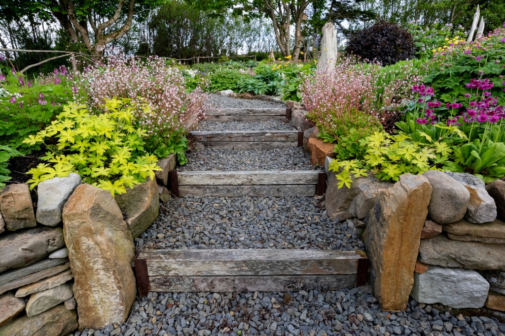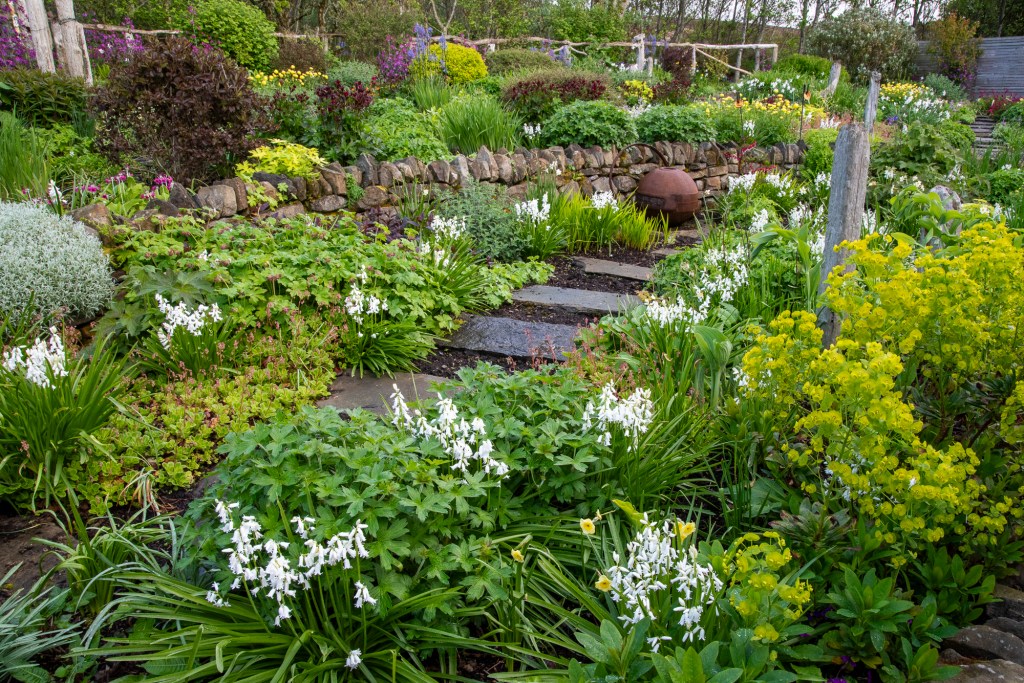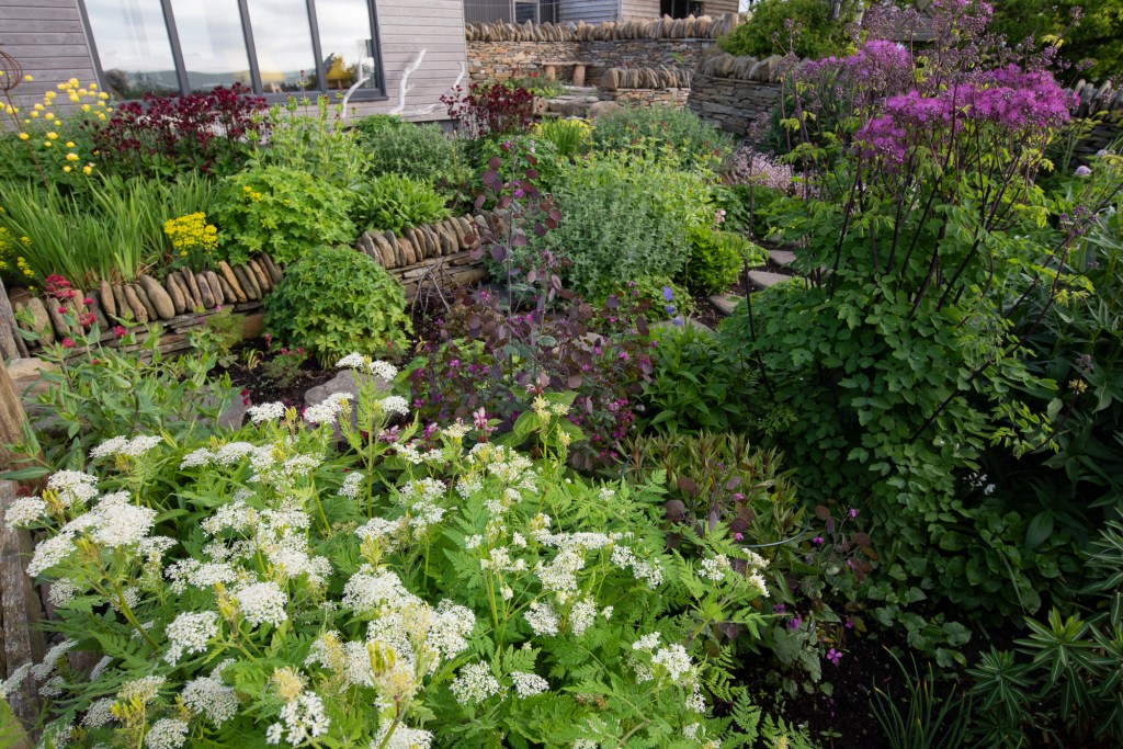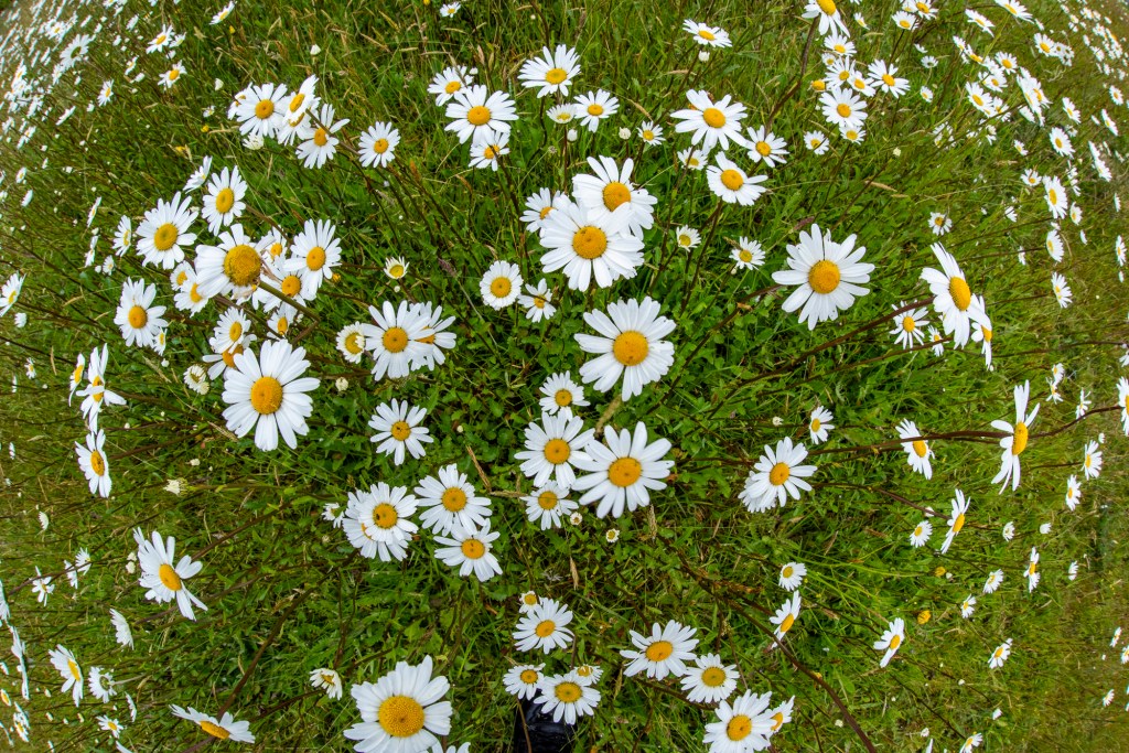 A friends house along the way takes its name from the daisies that once grew along the verges here, so for drier spots Ox-eyes were a given. They’re a doddle from seed and once planted self sow easily. The picture below was taken with a fisheye lens, the deliberate millefleur paperweight look might have been better without my boot toe, bottom centre 🙂