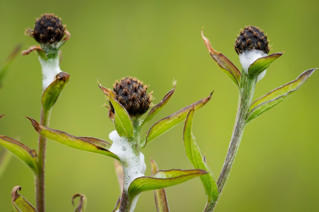 Plugs of other species have also been added, Common knapweed and Yarrow have both established well. The knapweeds are a favourite food plant of the appropriately named spittlebug, a tiny sap sucking nymph of the Common froghopper that hides itself from predators in a foam of bubbles – Cuckoo spit. This year it seems that every knapweed has them, each yet to open ‘hardhead’ bud that gives the plant its alternative name, has a side dressing of soapy froth.