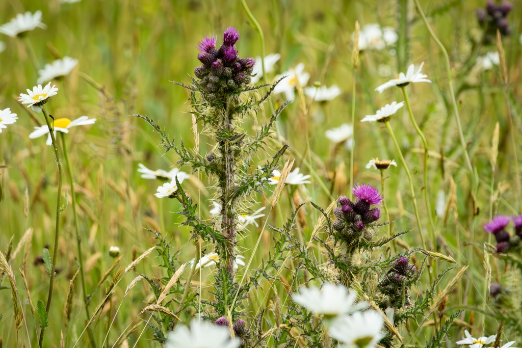 As some plants were being reintroduced many others returned without help, either from the fields own seed bank, woken by warmth and light, or carried here by the winds. Wind borne biennial Marsh thistles arrived in year two, they can be invasive but are perfect bee and insect food, like the yet to flower Scotch thistles that have also turned up, they’ll be thinned only if they get out of hand. Both are covered in long sharp spines that show no respect for gloves, the porcupines of the meadow.