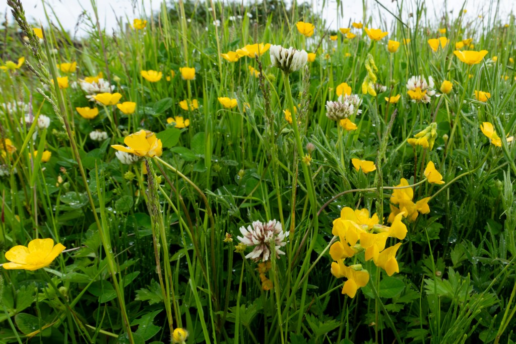 While most plants stretch upwards, showing off their wares to passing bees and butterflies there are also low level lurkers. A home made mix of native grasses with added ground hugging white clover and birds foot trefoil seeds, sown on a bare bank, has grown well. As with the rest of the meadow Creeping buttercup has inevitably introduced itself to the mix, an invasive plant that is a pain in the garden but welcome elsewhere.