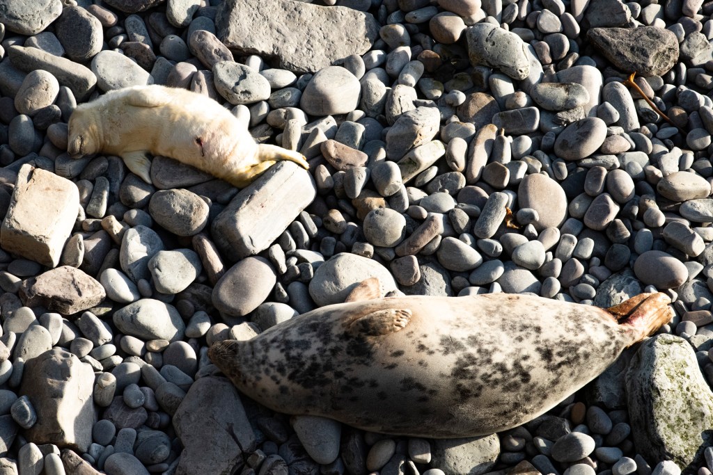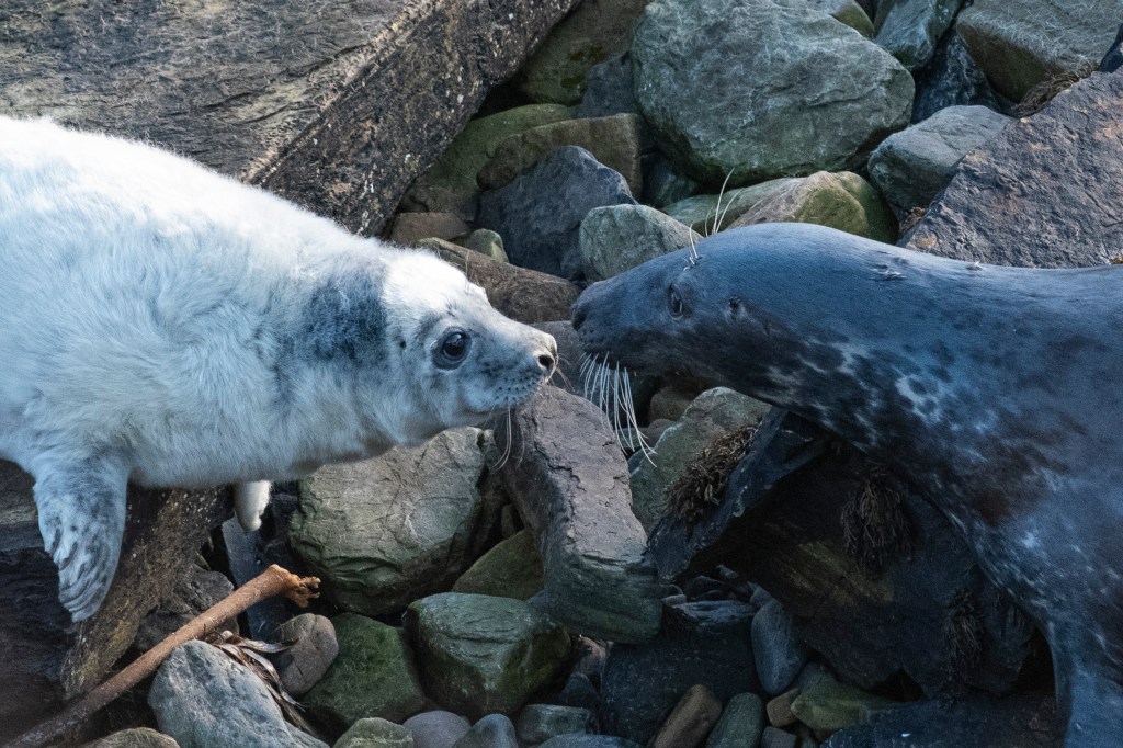 The weather has changed today, northerlies replaced by south-westerlies. At sunrise I walked down to the shore and took the photograph below. The grass was crunchy underfoot, white from an overnight frost, but the bite had gone from the air. Next week will bring warmth and a thaw. As I crunched down to the shore a small bob of ever inquisitive Harbour Seals appeared, homing in on the human, to see what he was up to.