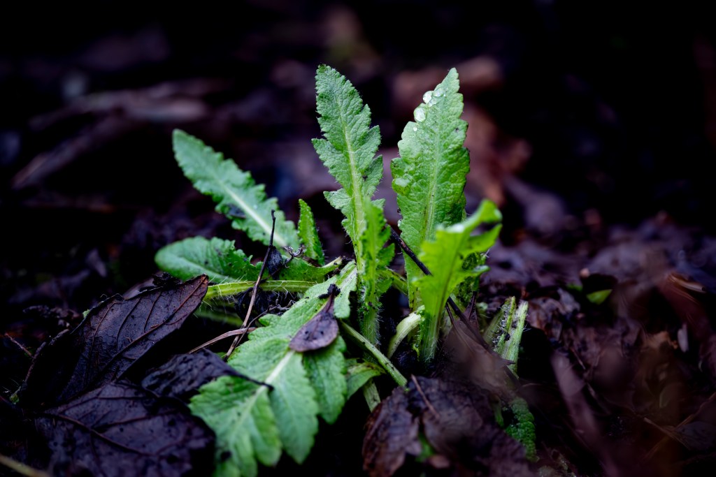 There’s younger life as well. In a sheltered spot, a perennial Poppy, planted in late Summer, is already pushing up through the earth. Bright green against last years fallen Alder leaves.